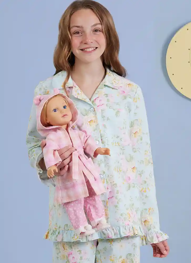 Lounge tops, gown, shorts and pants hems are trimmed with self-ruffles. Button closure tops and gown have shoulder seams that come to the front. Shorts and pants have elastic waist. Purchase sizes separately for Children’s and Girls. Fabric suggestions: A,B,C,D,E: Cotton/Cotton Blends, Flannel. Interfacing: Fusible Knit. Sewing Level: EASY.