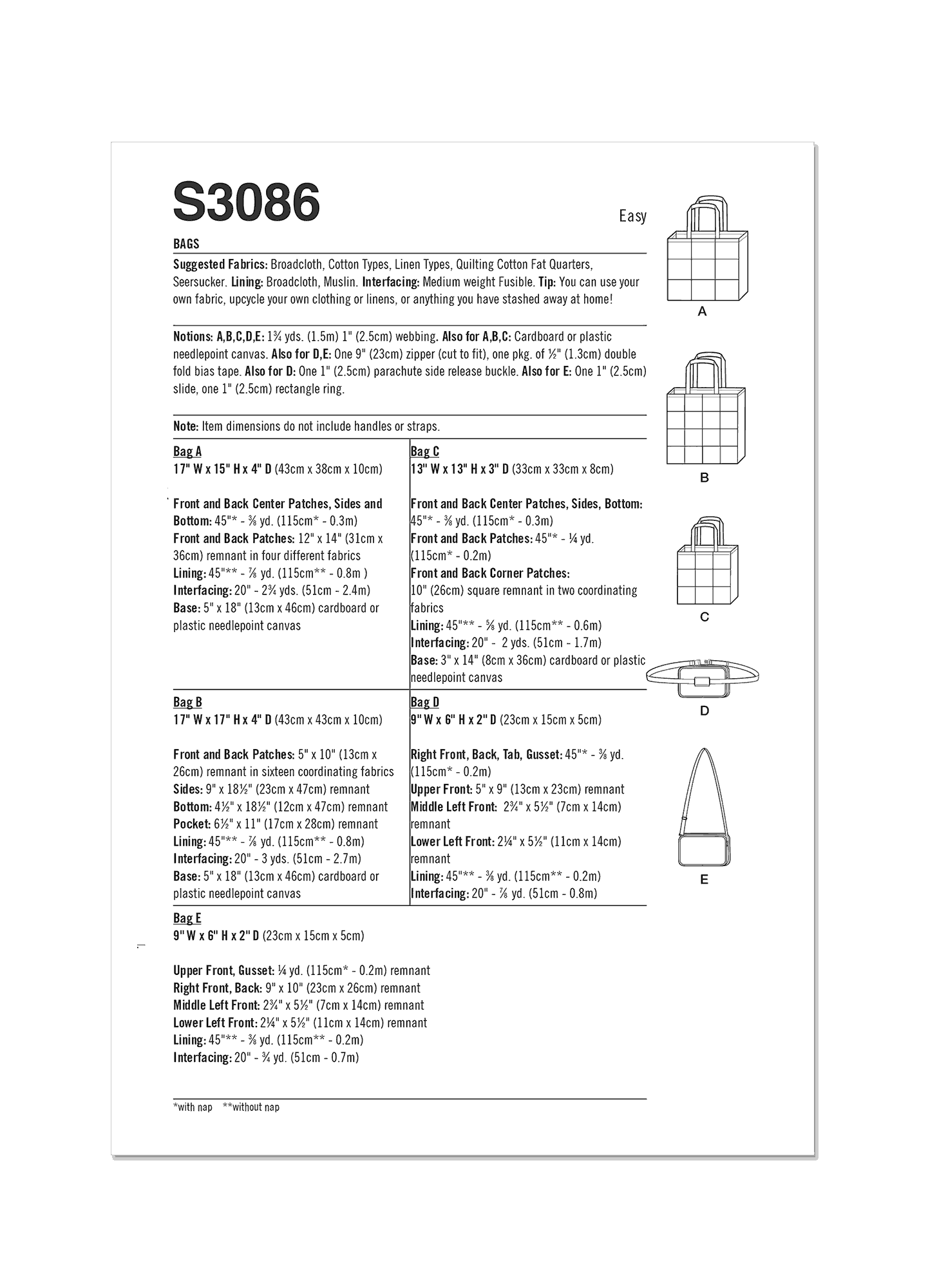 Easy to sew lined patchwork bags are perfect for stash-bashing or fat quarters. Totes in three sizes have webbing handles and base inserts for stability; largest and smallest totes have outer patch pockets for smaller items. Belt bag and crossbody purse with bias tape bound edges have front zippers, asymmetrical patchwork fronts and adjustable webbing straps. Belt bag has parachute clip closure. See envelope for more information. Broadcloth, Cotton Types, Linen Types, Quilting Cotton Fat Quarters, Seersucker. Lining: Broadcloth, Muslin. Interfacing: Medium weight Fusible. Tip: You can use your