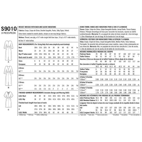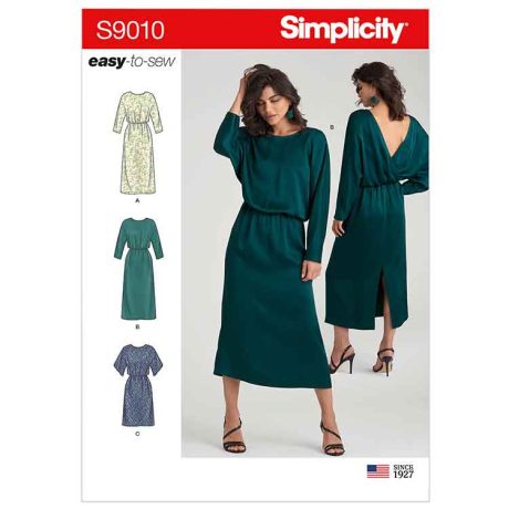 S9010 Misses’ Dresses with Length Variation. Loose-fitting dresses with elastic waist and grown-on sleeves. Options include cross-over back neckline and short or midi-length. Suitable for woven fabrics.