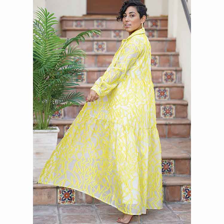 S9114 Misses’ Dress, Top & Pants. Misses’ button front, long dress with gathered tiers, long sleeves. Crop top. Pants have front pleats, fly and side pockets.