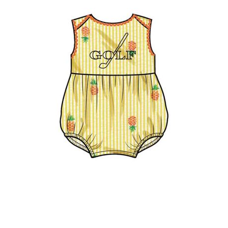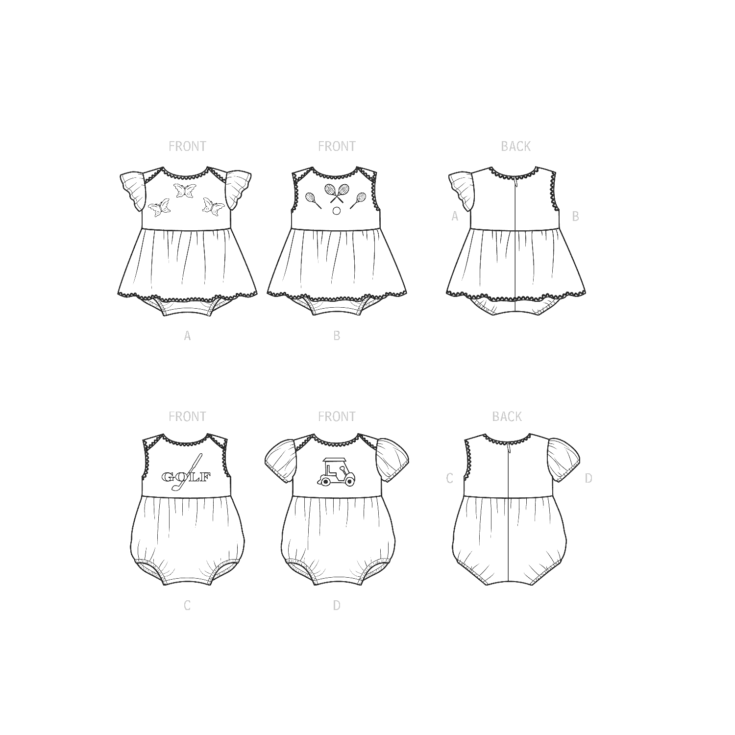 Shoulder lap neckline rompers with or without gathered skirts are detailed with purchased trim and appliques and have invisible back zipper and snap tape opening.
