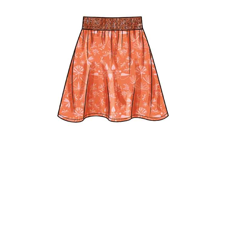 Side zipper dress and top with mock shirring have shoulder straps and ruffle peplum. Gathered circle skirt has elastic waistband. Easy.