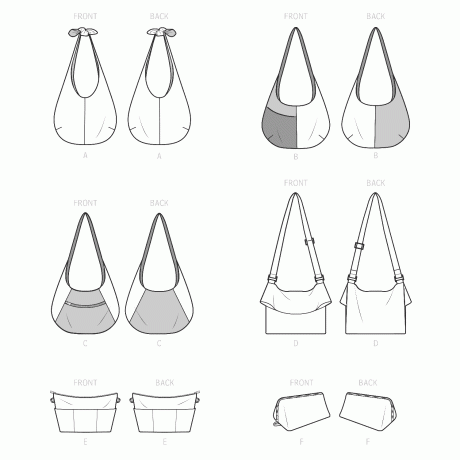 Roomy lined bags have soft construction and options that include tied or tailored shoulder straps, panels for fabric mixing, exterior pockets or fold over flap. Pattern includes zippered purse organizer insert and triangular cosmetic case. See envelope for more information. Easy. Andrea Schewe