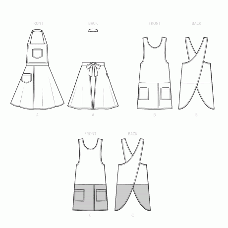 Bib front apron has waistband with back tie ends, halter neck strap, mock wrap flared knee length skirt and pockets with jeans-style stitching. Crossover back aprons have deep scooped armholes, patch pockets and mock wrap above knee length skirt that can be matching or contrasting fabric. See envelope for more information. Easy. Elaine Heigl Designs