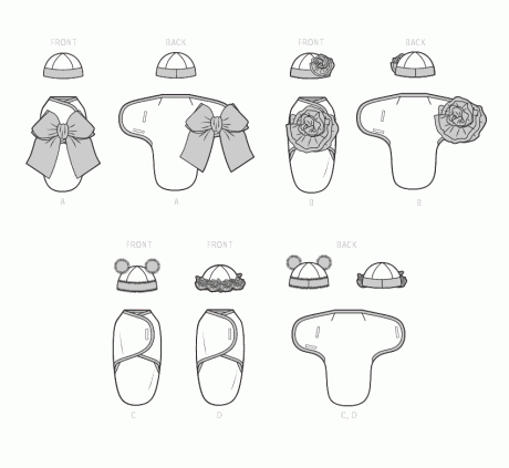 S9591 Babies’ Buntings and Hats. Bring home baby in lined buntings with contrast bias binding, hook and loop tape closures and oversized bow and rosette options. Lined hats in three sizes S (17″), M (18″), L (19″) have contrast bands and optional rosette, pom pom ears or flower crown embellishments.