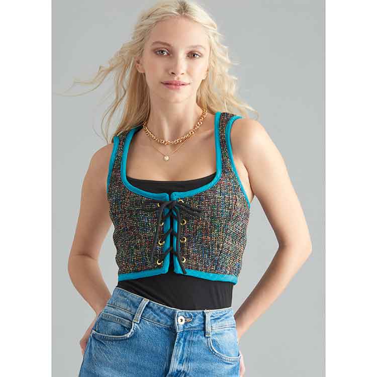 S9592 Misses’ Corsets. Versatile lined corsets have a smooth structured look without boning. All corsets have rounded square necklines, contrast fabric binding finishing and eyelets with lacing for an adjustable fit. Options include straight and shaped fronts and a variety of peplums.