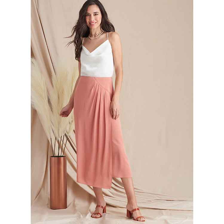 S9607 Misses’ Skirt. Faux wrap skirt has pleats set in side panel and asymmetric hem. Straight hem option has contrast panels. All skirts have back waist darts and invisible back zipper..