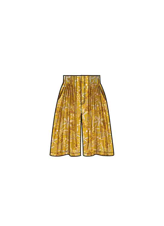 Short or long sleeve button down shirt and high waisted wide leg pants with cutting line for shorts have pleats, pockets and fly front opening.. . Average. Intermediate