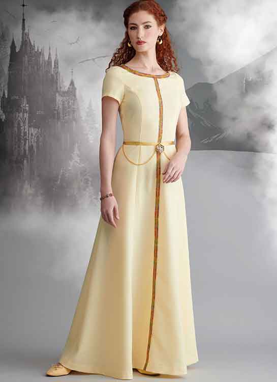 Medieval style dresses have princess seaming with seamed flared skirt, three sleeve styles and invisible back zipper closure. Trims add character to these figure flattering dresses. Sewing level: EASY.