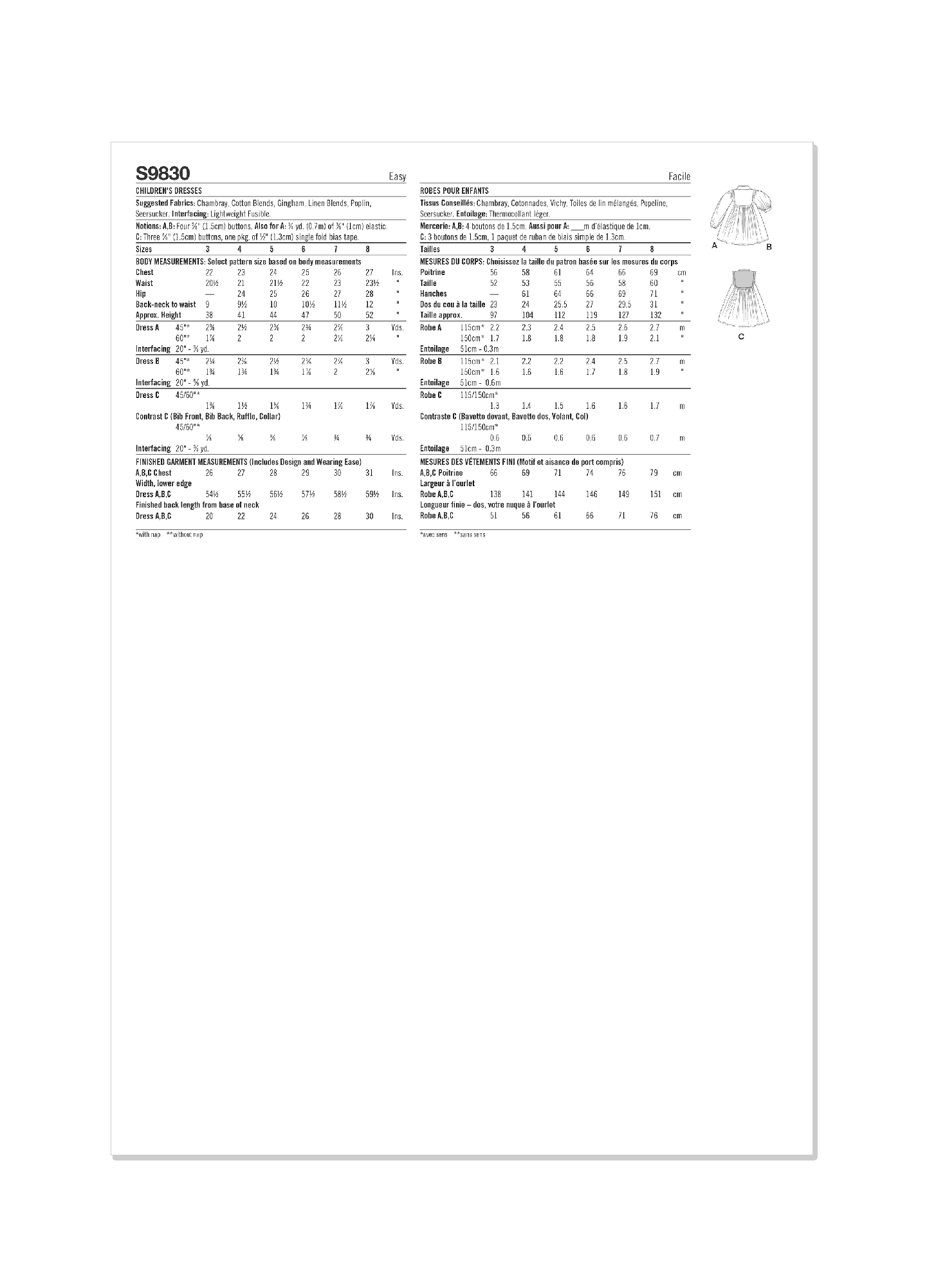 Easy to sew children’s dress has front and back bib, button front placket, gathered ruffle detail, and two collar options with three sleeve variations. Views A and B have pleated bib. View C has contrast bib, placket and band collar. Sewing level: EASY.
