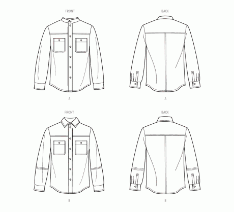 Misses’ and Men’s easy to sew shirt has banded or pointed collar, long sleeves with cuff, front and back yoke, and front patch pockets with button closure. Corduroy, Cotton Shirting, Faux Leather/Suede, Lightweight