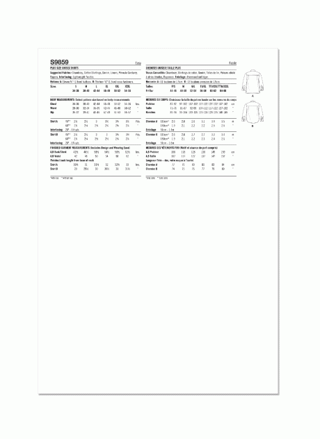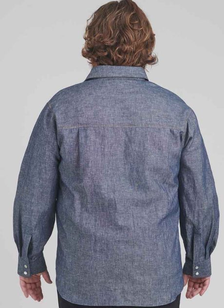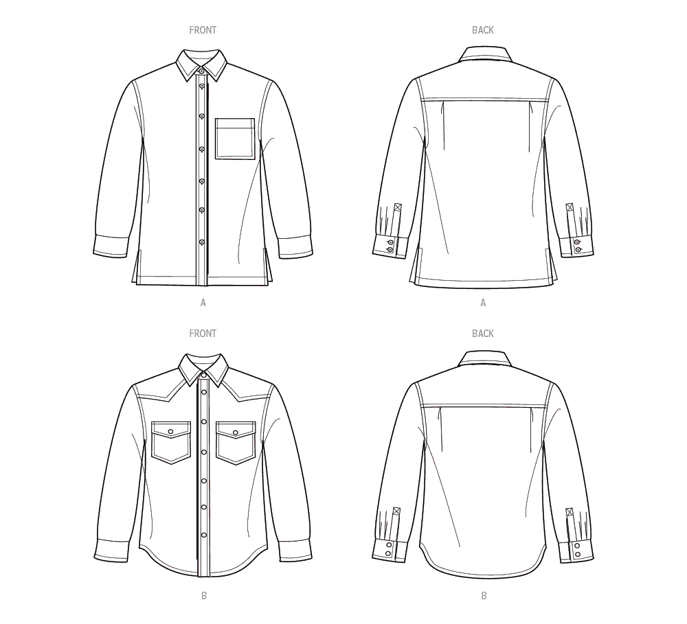 Women’s and Men’s easy to sew shirts have back yoke, long sleeves with cuff. View A button down shirt has single patch pocket and split hem. View B shirt has snap closure, front yoke, chest pockets with flap and button and shaped hemline. Chambray, Cotton Shirtings, Denim, Linens, Pinwale Corduroy,
