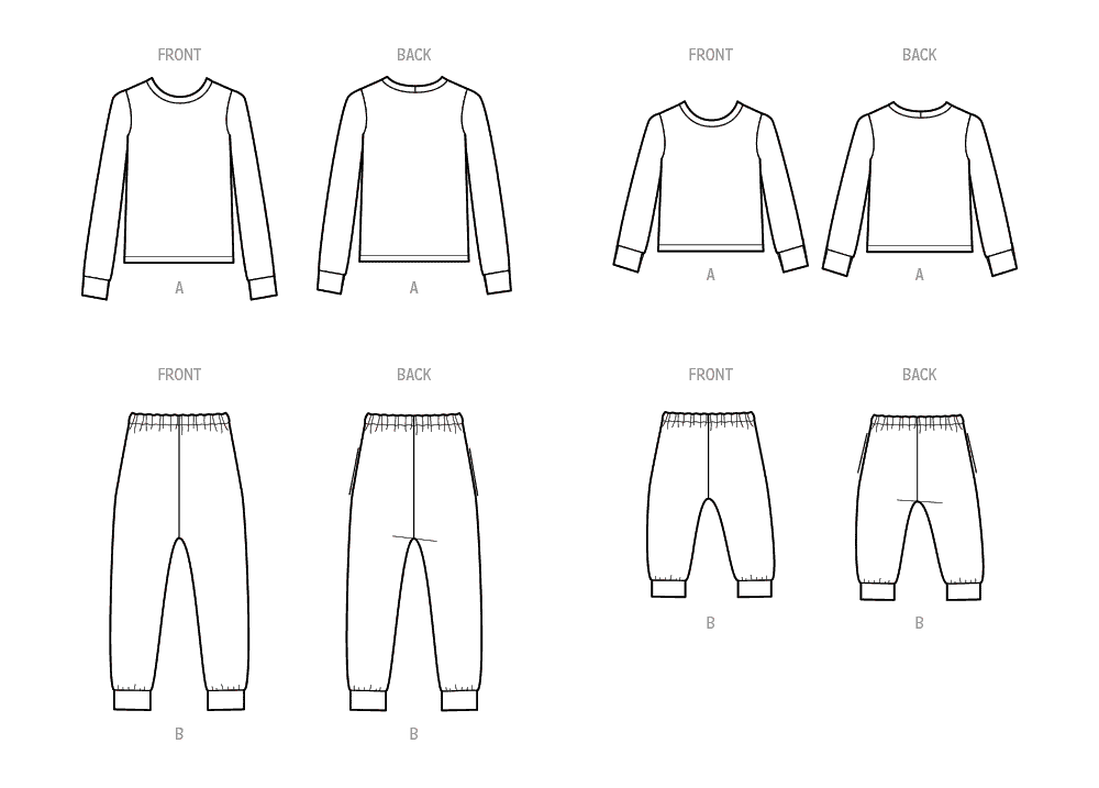 Two-piece lounge set sized for children and adults includes a long-sleeve t-shirt and pull on pants for a cozy ensemble. Pants have a full elastic waistband for a secure fit, and styled with banded cuffs to give you a more fitted finish. Stretch Knits only such as Cotton Jersey Knit. See Pick-A-Knit Rule. Sewing level: Very Easy.