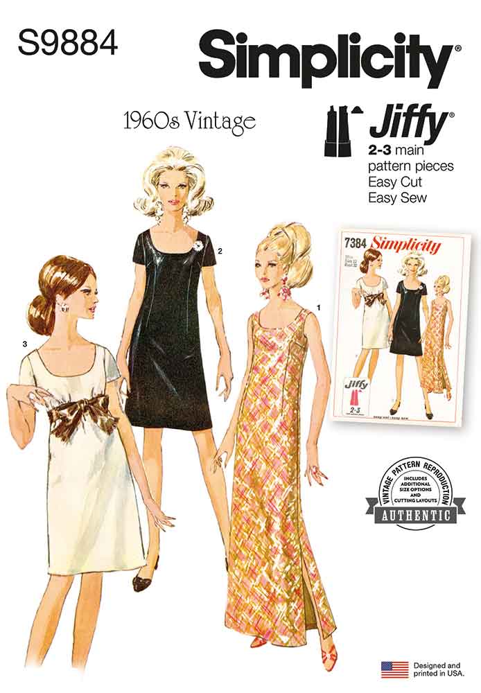 Vintage Simplicity 1960’s Jiffy dress sewing pattern. The collarless dress with low round neckline has back zipper. View 1 and View 2 have front and back waistline darts. View 1 sleeveless dress with slit in left side seam is ankle-length. View 2 and View 3 have short set-in sleeves. View 3 is worn with a ribbon sash. Authentic Vintage Reproduction includes additional sizes and cutting layouts. Brocade, Cottons and Blends, Crepe, Linen, Metallic Brocade and Crepes, Matelasse, Ottoman, Silks, Synthetics and Blends, Velvet, Velveteen. View 1 also in Eyelash Metallics, Satin. Views 2, 3 also in Double Knits, Lightweight Wools and Blends. Wool Crepe. Interfacing: Lightweight Sew-in. Sewing Level: Very Easy
