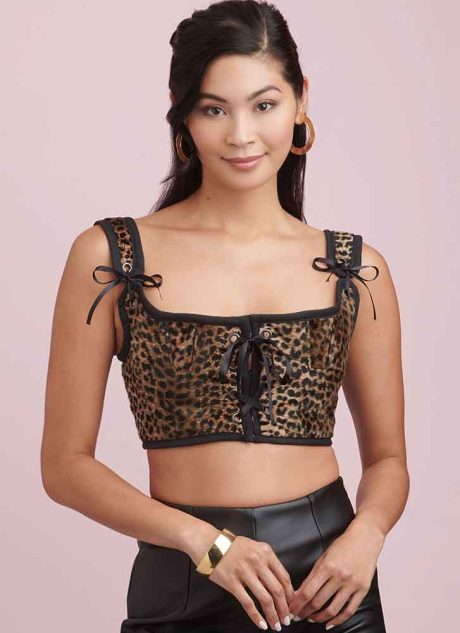 Done in modern fabrics, corsets can be worn every day. Corsets have boning at the center front, bias tape along the edges, and 2-part grommets at the center front closing and on straps. The front has bust gussets and the back has princess seaming. Fabric suggestions: Brocade, Cotton/Cotton Blends, Denim, Lightweight Home Dec Fabric, Twill.