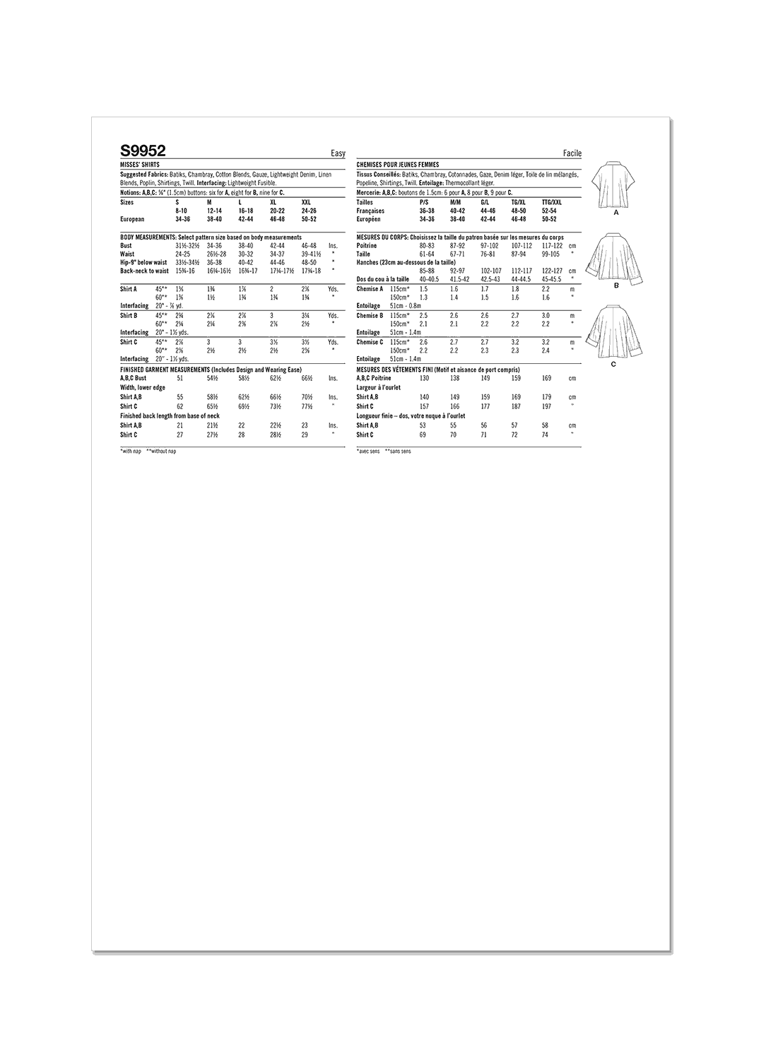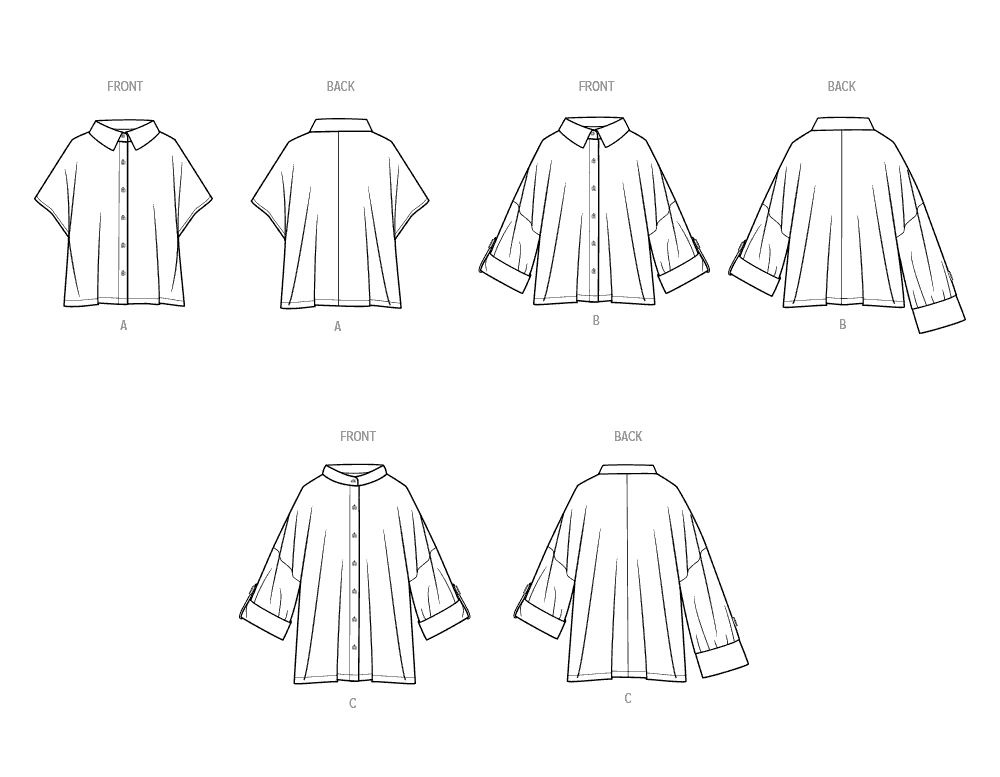 Oversized shirts in two lengths have dropped shoulder sleeves, button-front closure and collar or stand collar option. Views B and C have long sleeves with tab-button cuffs. Batiks, Chambray, Cotton Blends, Gauze, Lightweight Denim, Linen Blends, Poplin, Shirtings, Twill. Interfacing: Lightweight Fusible. Sewing level: EASY.