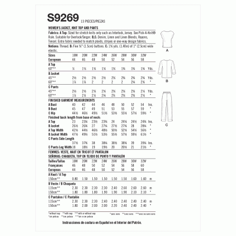 Simplicity Sewing Pattern S9269 Women’s Jacket, Knit Top & Pants. Women’s jacket with princess seams has three-quarter sleeve, stitched side seam pockets; knits only top has extended sleeve; cropped pull-on pants are slightly tapered. Average sewing pattern.
