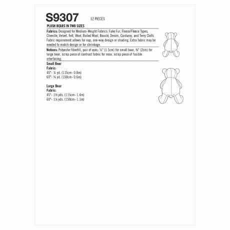Simplicity Sewing Pattern S9307 Plush Bears in Two Sizes. Plush bears to hug, snuggle & relax with have appliqued noses & secure safety eyes. Small bear measures 20″ high; large bear measures 29″ high. Average sewing pattern