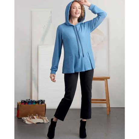 Simplicity Sewing Pattern S9384 Misses’ Sweatshirts. Pull-on pleated sweatshirts with or without hoodie. Options for straight or gathered sleeves and hem length variations.