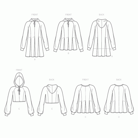 Pull-on pleated sweatshirts with or without hoodie. Options for straight or gathered sleeves and hem length variations.