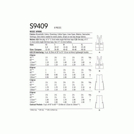 Simplicity Sewing Pattern S9409 Misses’ Aprons. Misses’ Aprons