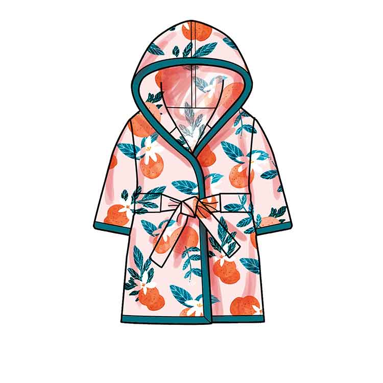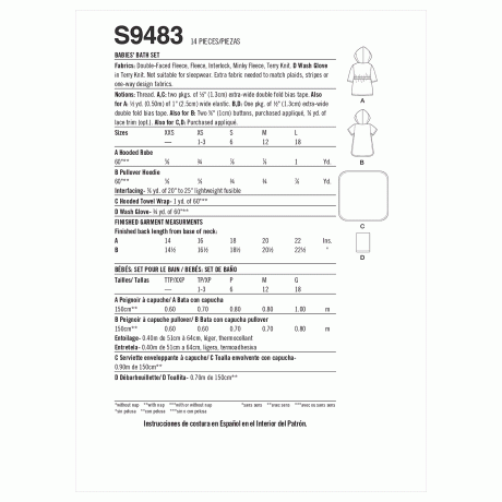 Unisex bath set has a hooded robe with bias tape trim, stitched down front ties and back elastic casing. Pull-over button front hoodie is trimmed with bias tape with optional trim and applique. Hooded towel wrap and hand wash glove are finished with bias tape and have purchased appliques.