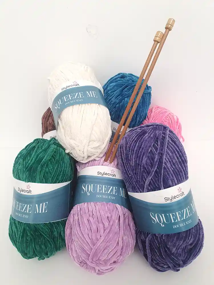 Following the trend for home comforts and the popularity of touchy-feely yarns, Stylecraft has introduced Squeeze Me, a luxurious chenille yarn which is velvety soft and irresistibly tactile. It just begs to be squeezed and cuddled. 100% polyester. 100g balls. 200m/218yds.
