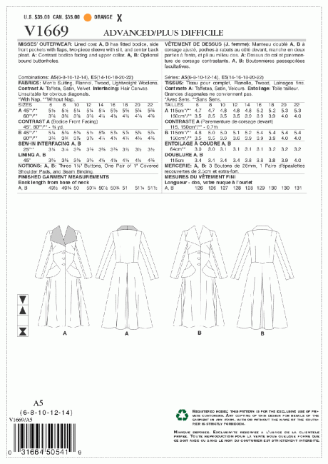 Lined coat has fitted bodice, side front pockets with flaps, two-piece sleeve with slit and center back pleat. A-Contrast bodice facing and upper collar. A, B-Optional bound buttonholes. Men’s Suiting, Flannel, Tweed, Lt.Wt. Woolens. Contra