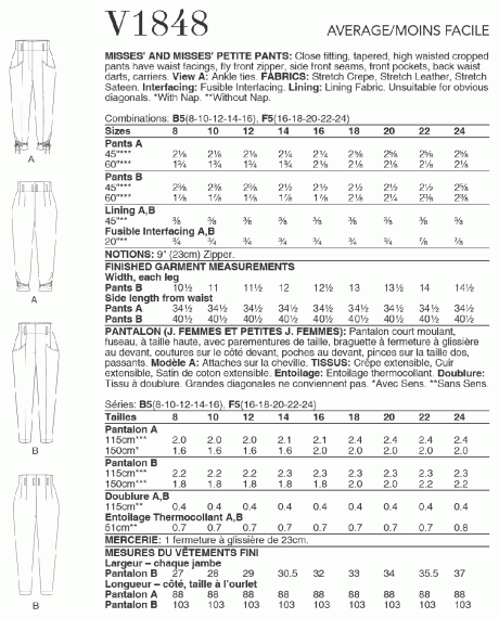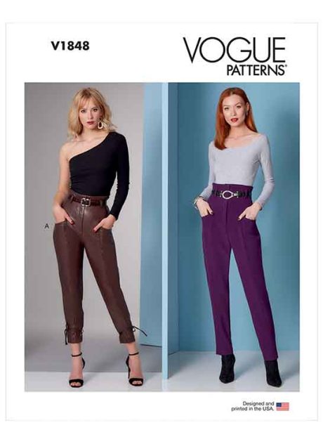 Close-fitting, tapered, high waisted cropped pants have waist facings, fly front zipper, side front seams, front pockets, back waist darts, carriers. View A: Ankle ties. FABRICS: Stretch Crepe, Stretch Leather, Stretch Sateen. Inter