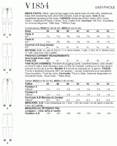 Fitted, tapered leg jogger-style pants have rib knit cuffs, elasticized waist with drawstring cord, side front pockets, back of leg seam. View A has topstiched paneling at the knee.