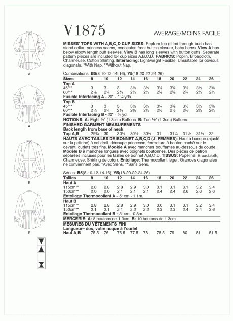 Peplum top (fitted through bust) has stand collar, princess seams, concealed front button closure and baby hems. View A has below elbow length puff sleeves. View B has long sleeves with button cuffs. Separate pattern pieces are included for cu