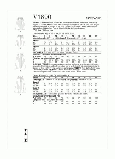 Flared skirts have contoured waistband with button closure, fly zipper, side front pockets, front and back unpressed pleats, narrow hem, and length variations. Easy. FABRICS: Linen, Royal Twill, Broadcloth, Challis. Lining: Lining Fabric. Interfacing: Lightweight Fusible. Unsuitable for obvious diagonals.