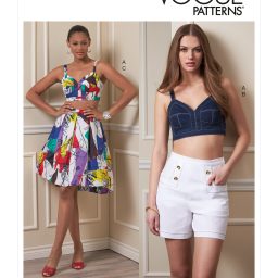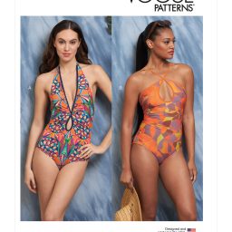 Lined swimsuits have contrast narrow binding, ruching, front cutouts, and leg openings finished with elastic. View A is halter style and ties in back. View B has narrow straps. Average. FABRICS: Swimwear Fabrics with 4-way Stretch (75% Crossgrain). See Stretch Gauge. Lining: Swimwear Lining. Unsuitable for obvious diagonals.