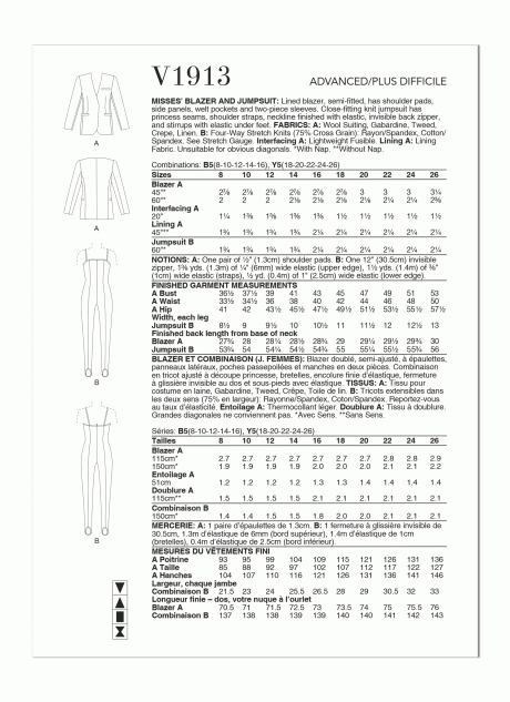 Lined blazer, semi-fitted, has shoulder pads, side panels, welt pockets and two-piece sleeves. Close-fitting knit jumpsuit has princess seams, shoulder straps, neckline finished with elastic, invisible back zipper, and stirrups with elastic under feet. Advanced.