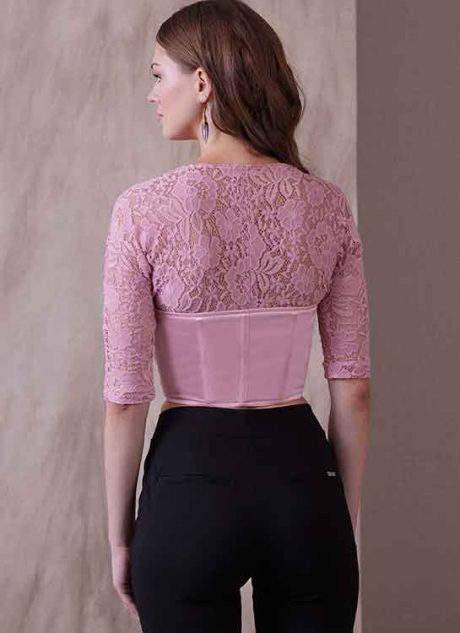 Lined, close-fitting corset top has fully interfaced body, boning, sweetheart neckline, hook and eye front closure, and contrast knit. View A has above elbow length sleeves. View B has long sleeves. Separate pattern pieces are included for cup sizes A, B, C, D. Sewing difficulty: Average.