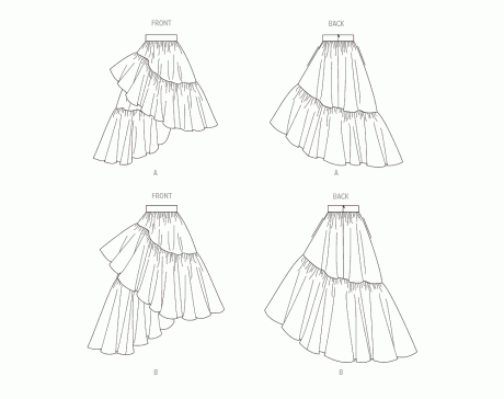 Asymmetric ruffled skirt has invisible back zipper, side seam pockets, baby hems and length variations. Sewing level: Easy.