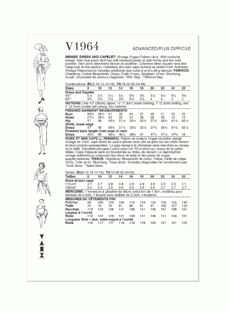 Vintage Vogue Patterns circa 1950 couturier design. Slim four-piece skirt has soft released pleats at side-fronts and two welt pockets. Skirt joins sleeveless blouse at waistline. Collarless deep square neck-line. Deep tuck at mid-section. Collarless shoulder cape buttons at center-front. Authentic Vintage Reproduction includes additional size options and cutting layouts. Chambray, Cotton Broadcloth, Crepe, Faille Crepe, Gingham, Linen, Shantung, Surah. Sewing level: advanced.