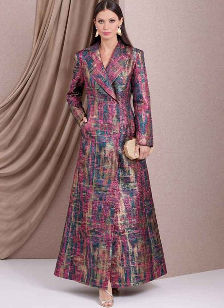 Lined coat has peak lapels, extended shoulders, shoulder pads, two-piece sleeves, waist darts, front in-seam pockets, concealed snap front closure and back vent. View A has bow detail. Brocade, Denim, Medium to Heavyweight Woolens. Lining: Lining Fabrics. Interfacing: Medium-weight Fusible. Sewing level: ADVANCED.