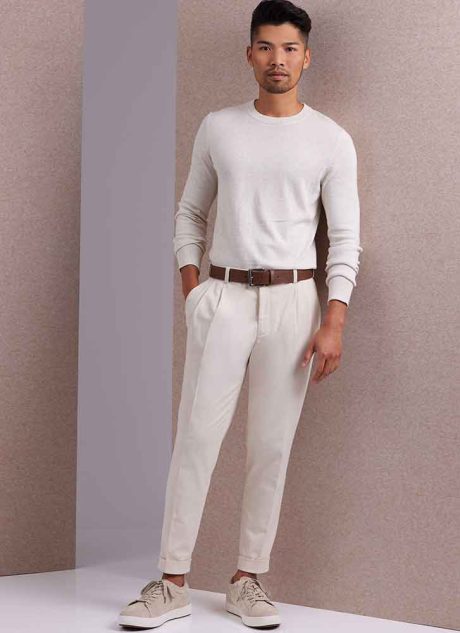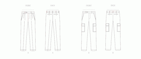 Slim fit, tapered leg pants sit on the hip, have fly front zipper, belt carriers, side front pockets and welt pockets on back. View A has a pleated front. View B has a flat front and cargo pockets with buttoned flaps. Gabardine, Twill, Wool Blends. Lining: Broadcloth. Interfacing: Lightweight Fusible. Sewing level: AVERAGE.