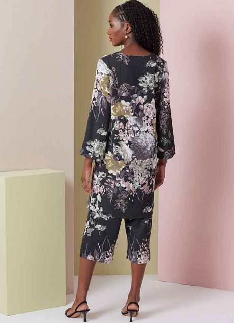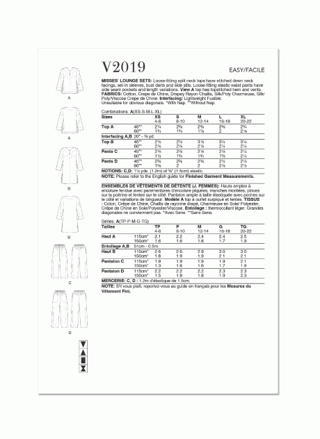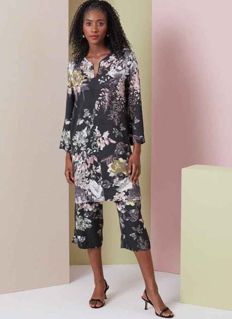 Loose-fitting split neck tops have stitched down neck facings, set-in sleeves, bust darts and side slits. Loose-fitting elastic waist pants have side seam pockets and length variations. View A top has topstitched hem and vents. Cotton, Crepe de Chine, Drapey Rayon Challis, Silk/Poly Charmeuse, Silk/