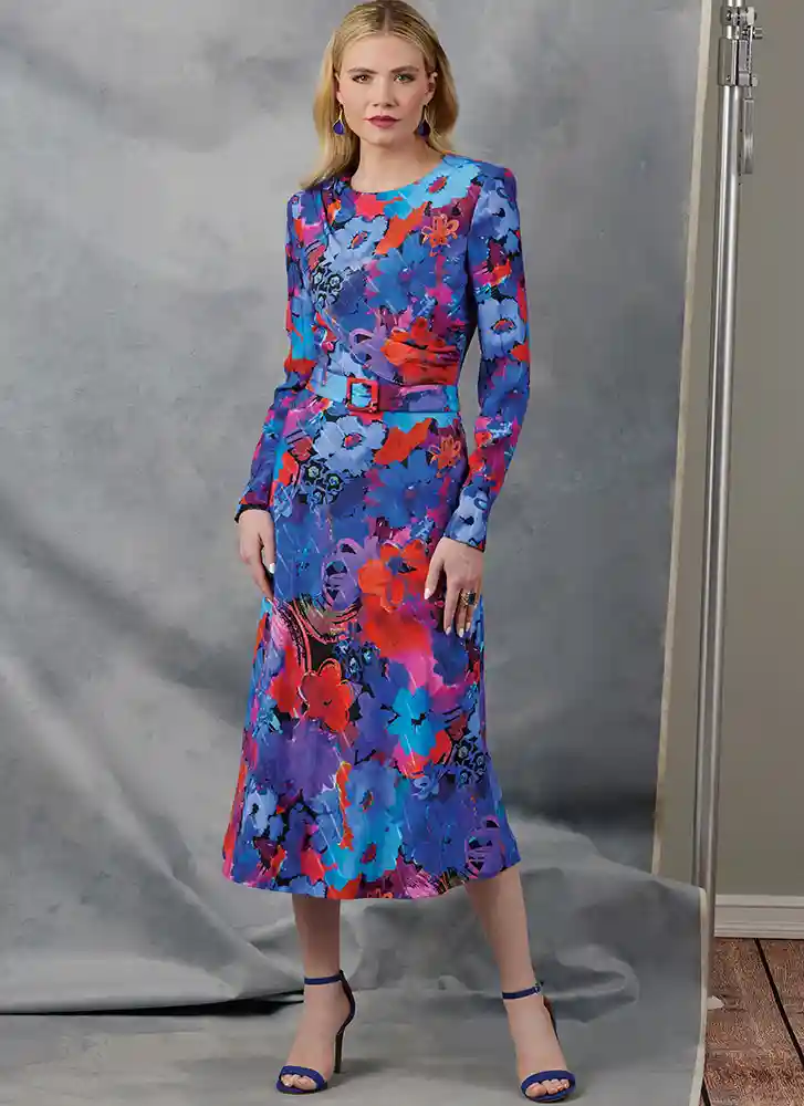 Unlined dress, close-fitting through bust, has shoulder pads, asymmetric front drape (cut on the bias) gathered to shoulder and side seam, princess seamed bodice, bias cut skirt, matching belt with self-covered buckle and thread loops. View A has long, tapered sleeves with elbow darts and invisible zipper opening. View B has bishop sleeves with buttoned cuffs and lap opening. Suggested fabrics: Crepe Back Satin, Matte Jersey, Rayon Challis, Silk Jacquard. Interfacing: Lightweight Fusible. Belt Backing: Synthetic Leather. AVERAGE.