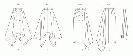Trench inspired wrap midi skirts have button front closure, belt loops, matching belts, welt pockets and topstitched hem. View A has handkerchief hem. View B has asymmetric drape detail. Suggested fabrics: Medium Weight Denim, Synthetic Leather, Twill, Wool Suiting. Lining: Lining Fabric. Interfacing: Lightweight Fusible. AVERAGE.