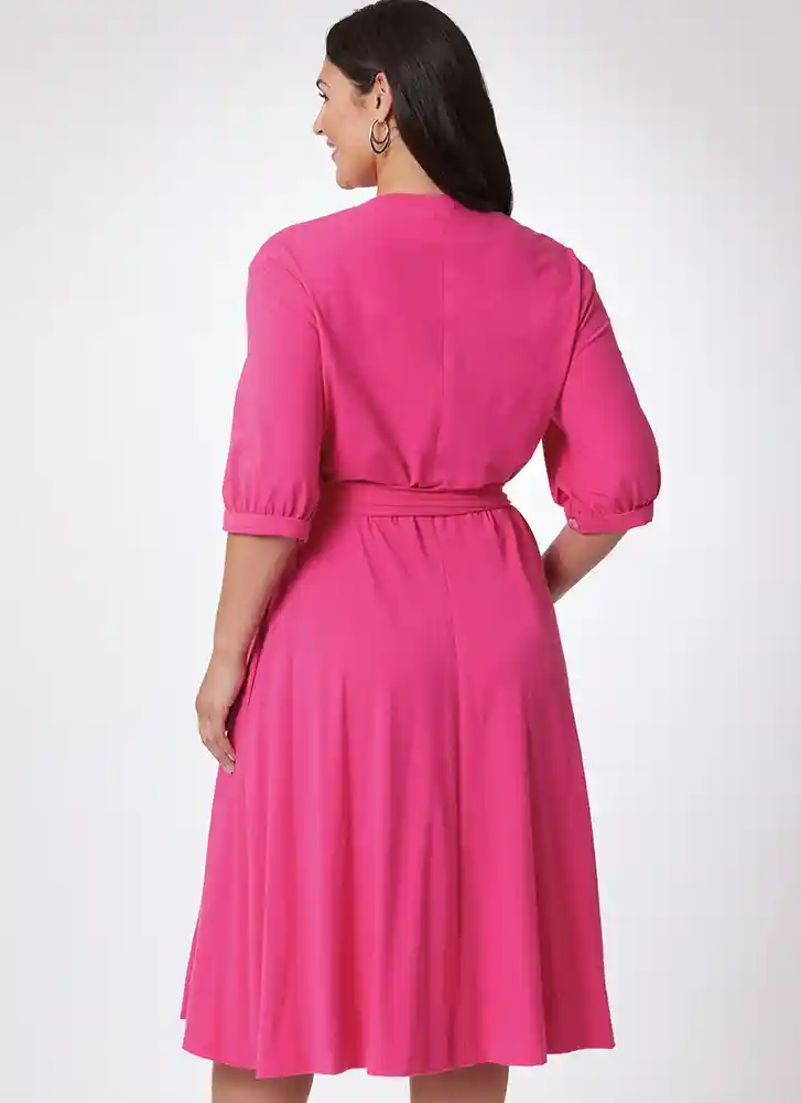 Vintage Vogue Patterns 1970’s Dress by Diane von Furstenberg. For Stretchable Knits Only. Front wrap dress, three inches below mid-knee, has fitted bodice, V-neckline, neckline bands, pockets in side seams, attached tie ends holding in fullness at waistline and above elbow length sleeves gathered into buttoned bands or full-length sleeves gathered into buttoned cuffs. Topstitch trim. Authentic Vintage Reproduction includes additional size options and cutting layouts. Stretch Knits only such as Cotton Knits, Double Knits, Jersey, Lightweight Double Knits, Synthetic Single Knits. See Stretch Gauge. Not suitable for diagonal fabrics. Interfacing: Lightweight Fusible. Sewing level: Easy. Diane von Furstenberg