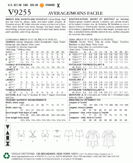 Close-fitting, lined bra has front tie, pleats, darts, and back button closure. A: Shoulder straps. B: Halter shoulder straps and band at bottom. Fitted lined shorts have darts, facings and back zipper. Very loose-fitting, pullover coverup has front and back faced yokes, patch pockets and roll up sleeves.