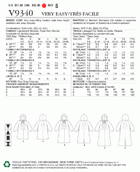 Very loose-fitting hooded coats have length variations and snap closures. Light Weight Woolens, Ponte Knit, Flannel. Very Easy