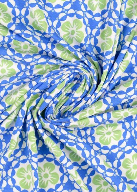 Soft and smooth viscose jersey with another summery print in rich Mediterranean sky blue and fresh green on a white background. Ideal for summer dresses and tops. 95% viscose, 5% elastane. 151cm wide, 220gsm. Oeko-Tex Standard 100 class 1.