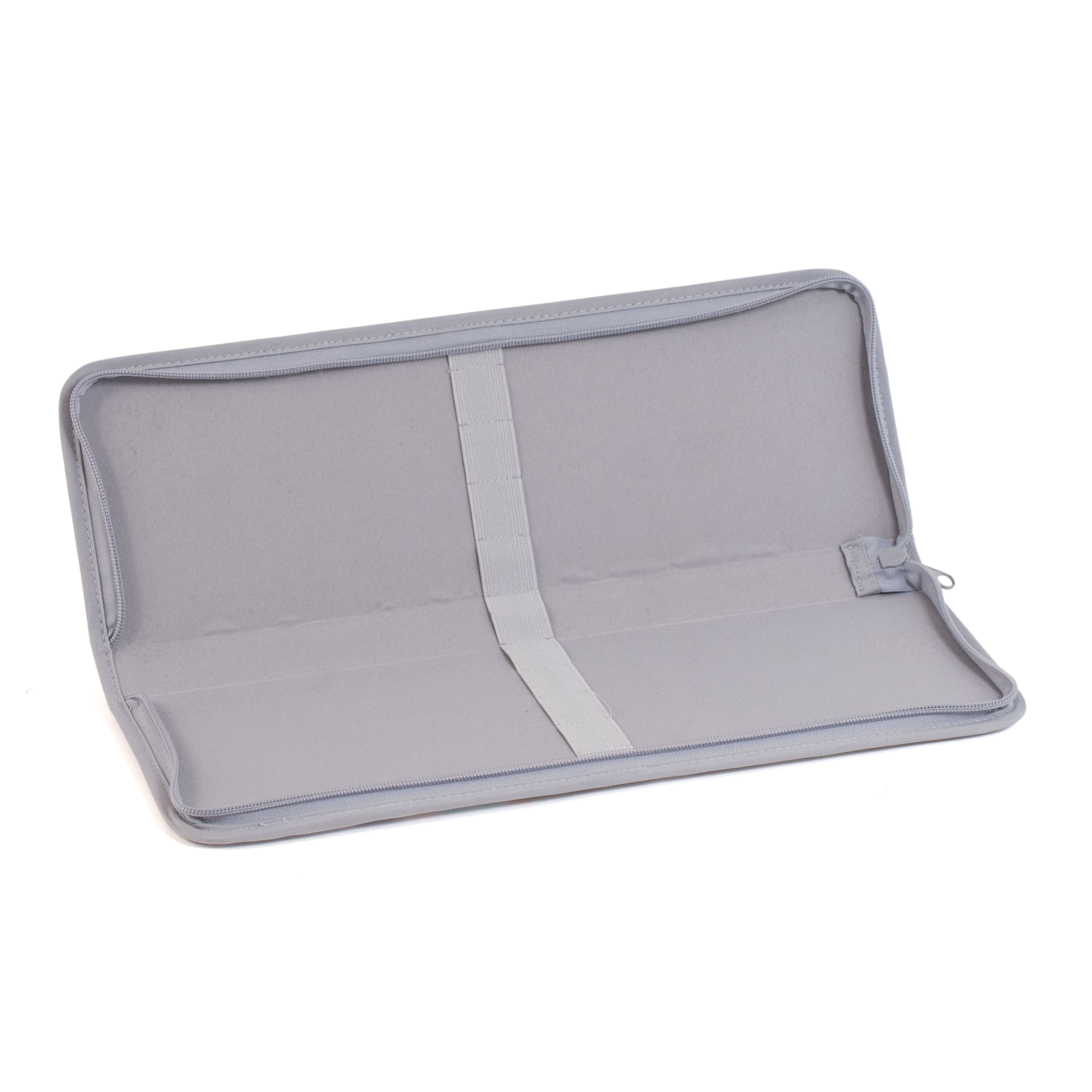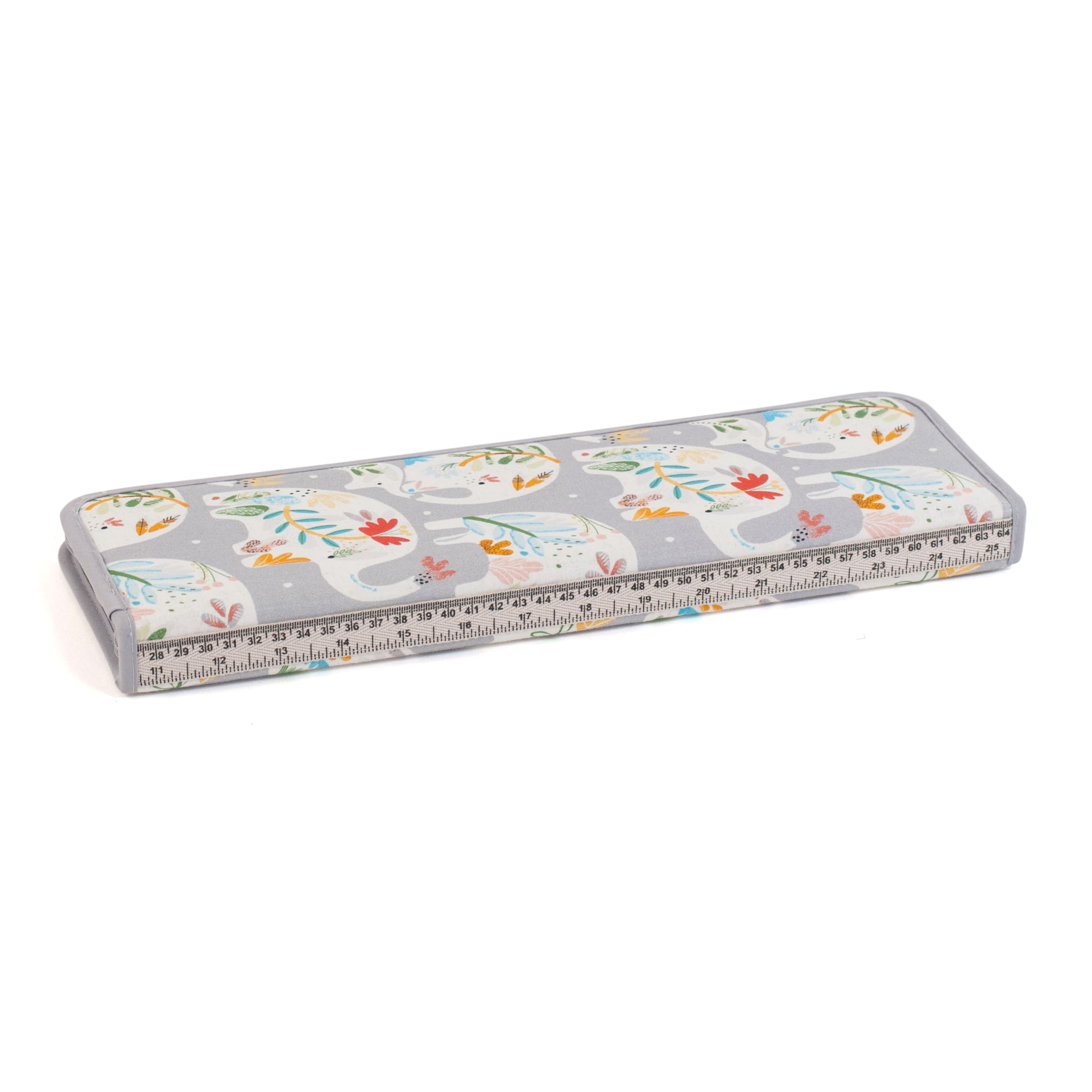 Hard, zippered knitting pin and crochet hook case. Elephant print cotton cover has a tape measure trim down the spine for handy measuring. Internal elastic loops to keep hooks and pins tidy. Spot clean only. Size: (d/w/h) 13 x 38 x 3cm.
